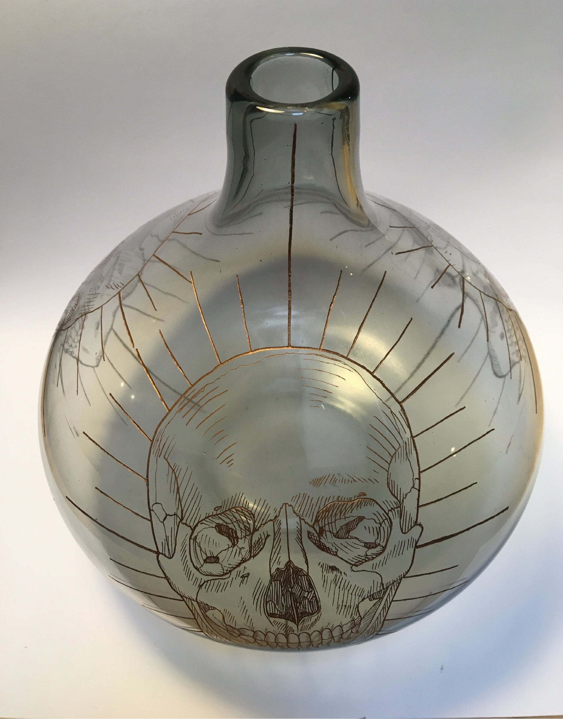 Dessin gravé sur flacon en verre de seconde main, 2018