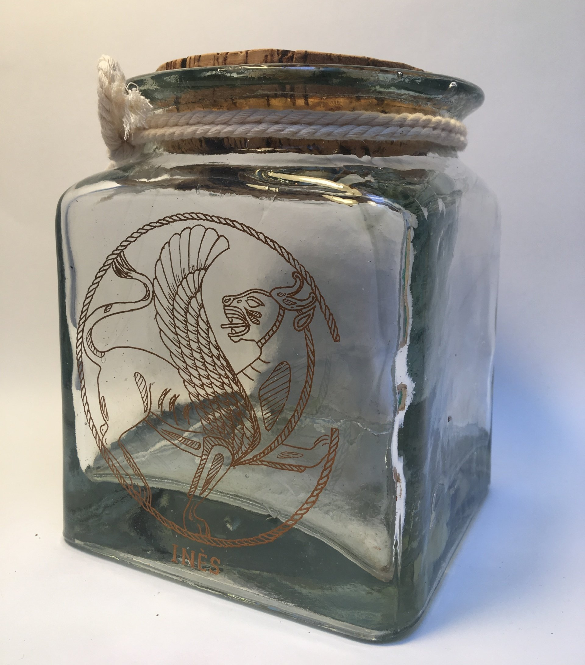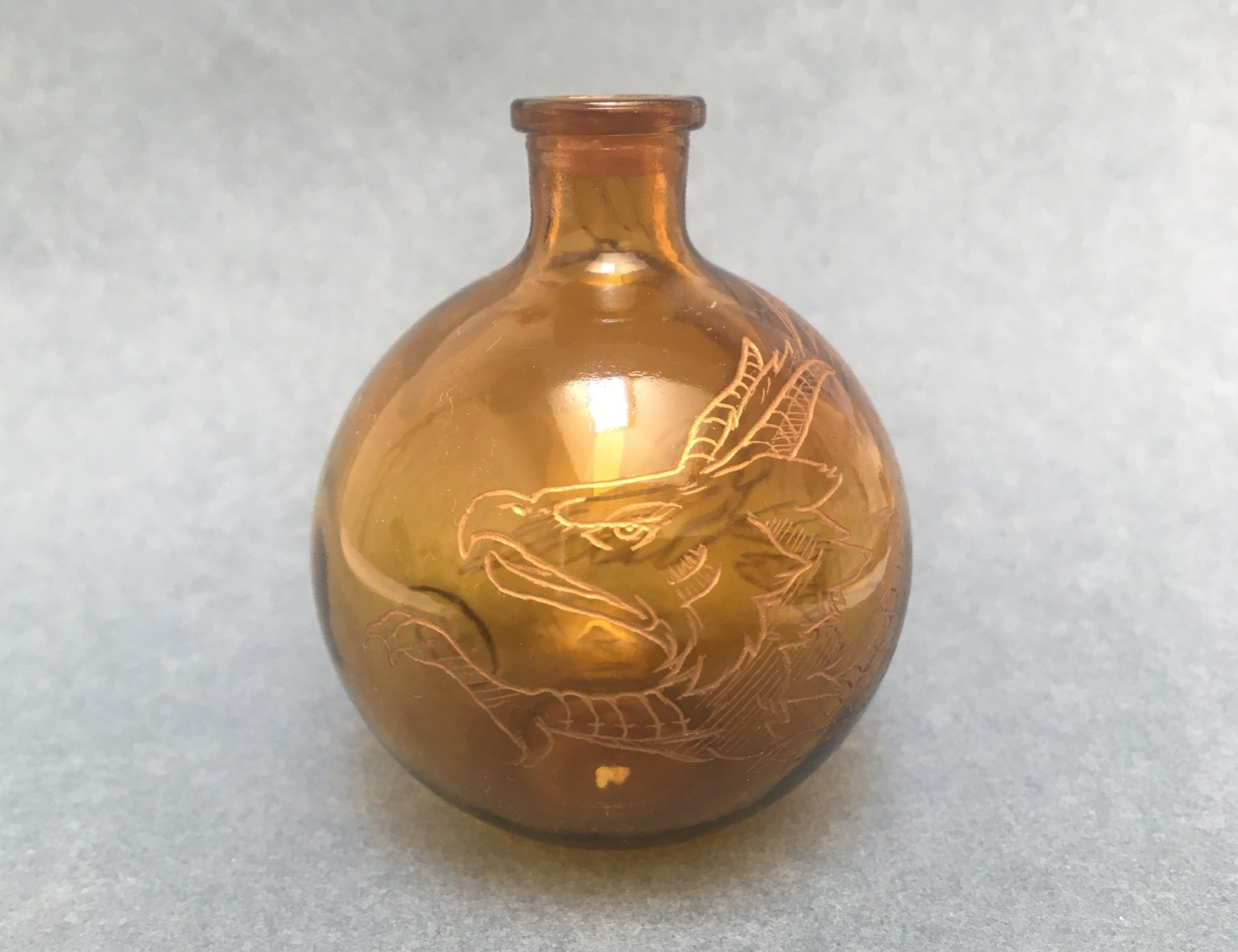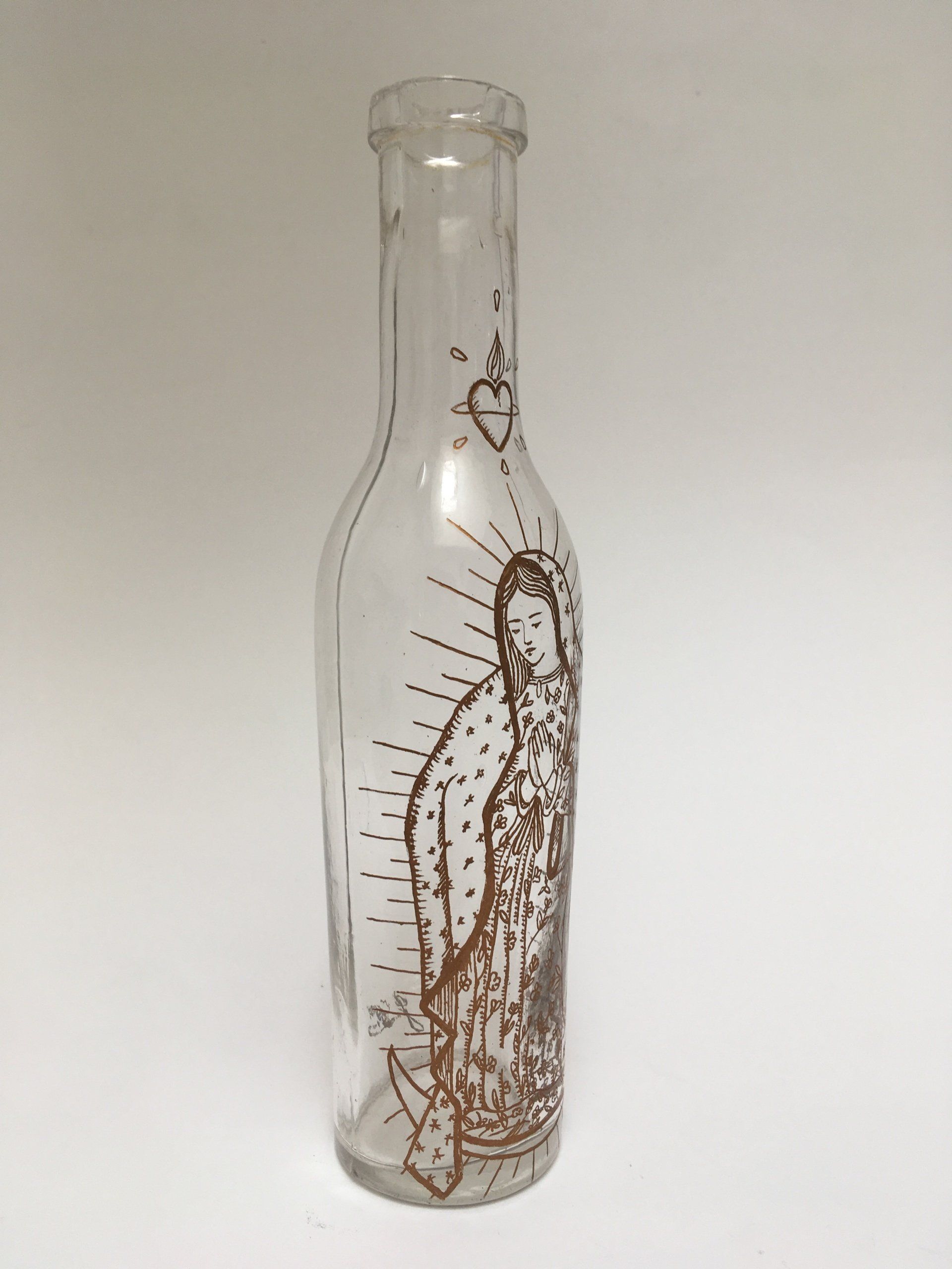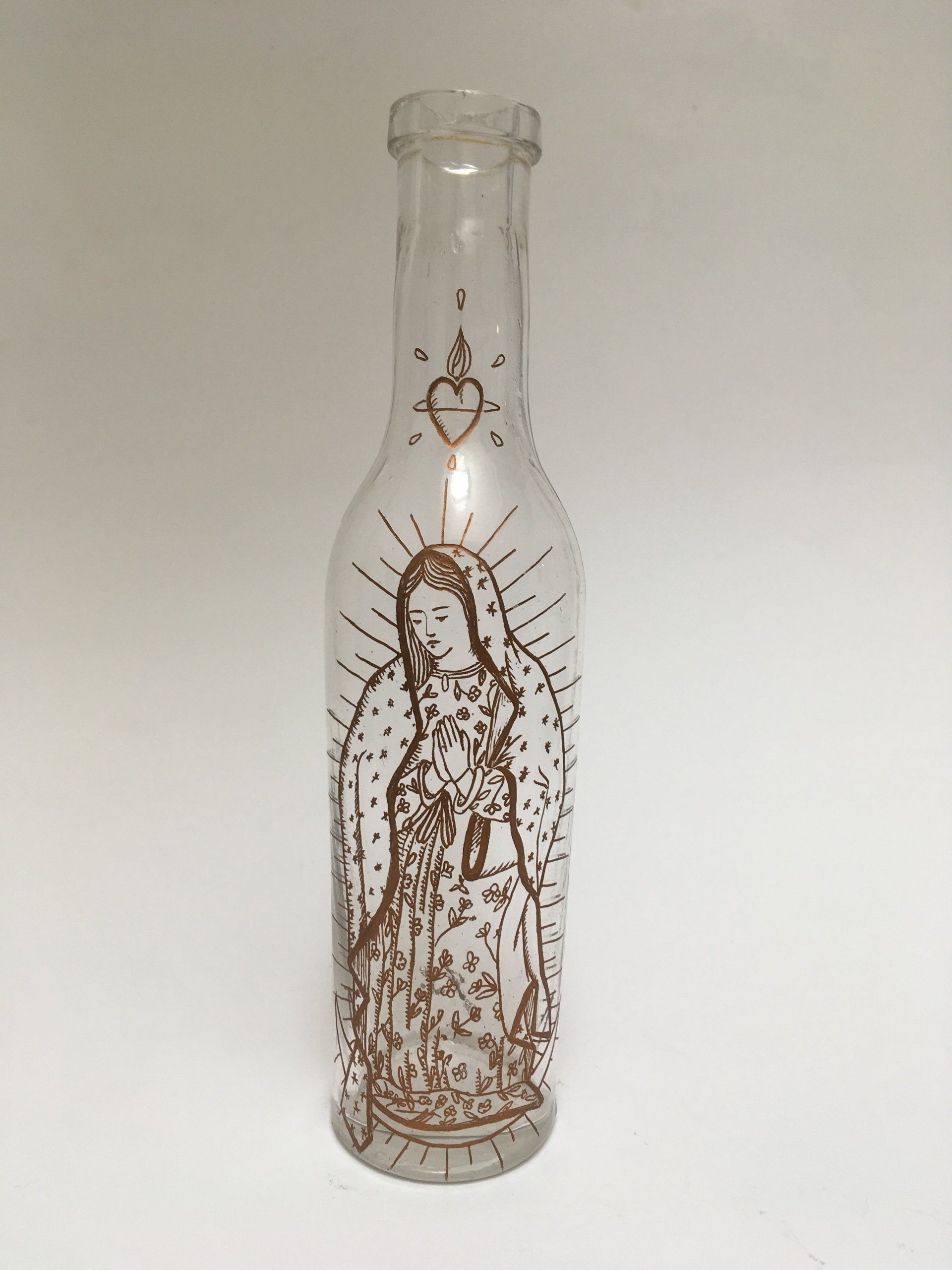 Dessin gravé sur flacon en verre de seconde main, 2019